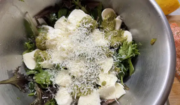 микс бейби салати - 200 гмоцарела - 200 гпармезан - 20 гбосилеково песто - 100 гзехтин - на вкуслимон - 1/2 прясно изцеден соксол - на вкус* мерки и количества