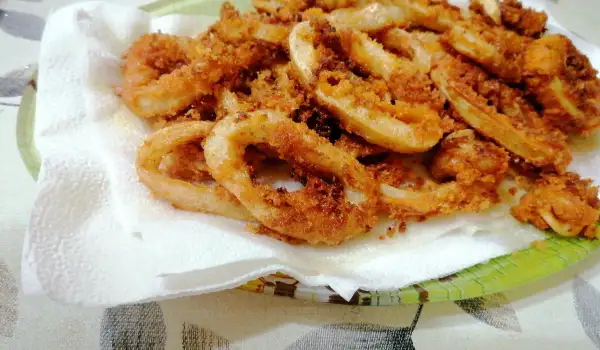 Започнете с почистването на калмарите. За по лесно премахване на люспата, ги залейте с вряла вода и изчакайте около минута-две. След това ги отцедете на кухненска хартия и ги обелете. Премахнете на всеки един и вътрешната му кост, след което ги нарежете на колелца с приблизително еднаква дебелина.